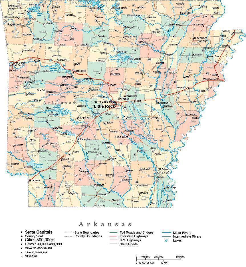 Arkansas with Capital, Counties, Cities, Roads, Rivers & Lakes